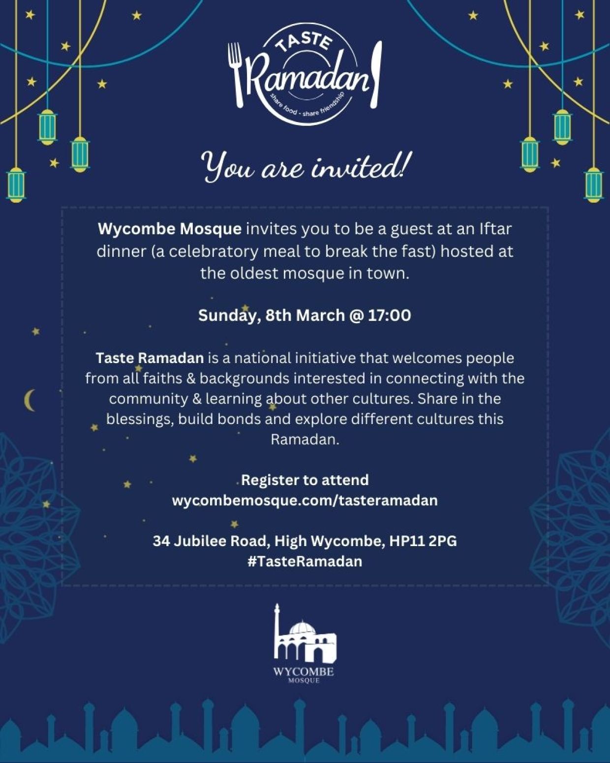 Since 2019, Wycombe Mosque has proudly hosted Taste Ramadan, an annual event that brings the community together to explore the essence of Ramadan. This gathering offers an opportunity to learn about the sacred month and its significance to Muslims worldwide. Enjoy an evening of delicious food, meaningful conversations, and an opportunity to learn about this sacred month. Whether you're fasting or just curious, everyone is welcome to connect, share, and celebrate unity in our diverse community.